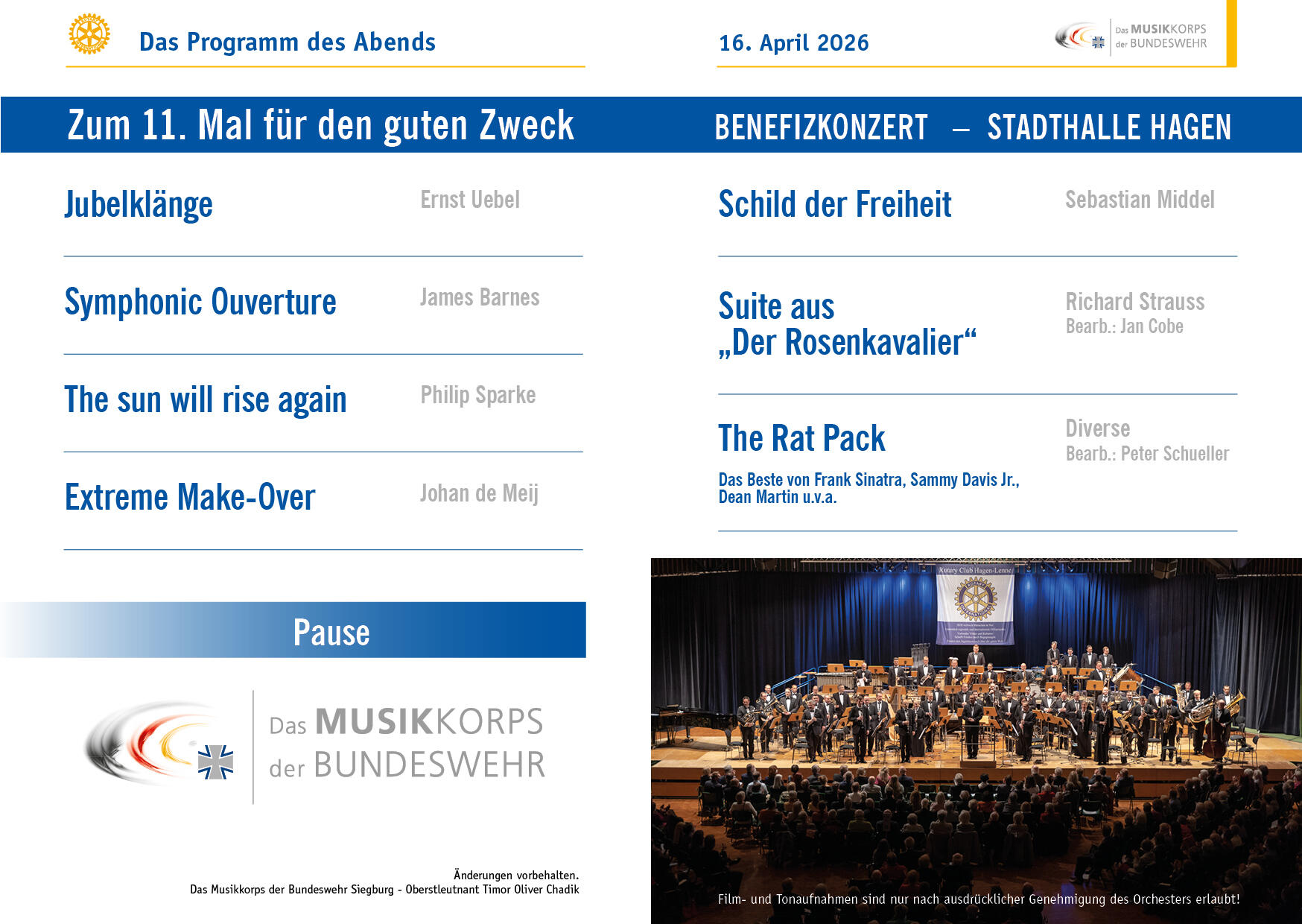 Bereits zum elften Mal ist es dem Rotary Club Hagen-Lenne gelungen, das Musikkorps der Bundeswehr für ein Benefizkonzert in der Hagener Stadthalle zu gewinnen. Das „musikalische Aushängeschild Deutschlands“, wie das international renommierte Blasorchester auch bezeichnet wird, bringt ein vielfältiges Programm auf die Bühne – wie immer ein einzigartiger Konzertmix aus Klassikern und modernen Stücken. Die detaillierte Übersicht der Stücke, die gespielt werden, wird in Kürze hier auf der Seite veröffentlicht. Oder Sie schauen im Facebook- oder Instagram-Account des Rotary Club Hagen Lenne.Wie in den Vorjahren auch ist der Gesamterlös für einen guten Zweck bestimmt – zur Unterstützung von zahlreichen Schulprojekten und Aktivitäten für Hagener Kinder und Jugendliche.In den bisherigen zehn Konzerten, die das Musikkorps in Hagen seit 2003 gegeben hat, konnte der Rotary Club Hagen-Lenne insgesamt rund 300.000 Euro an Erlösen erzielen, die vollständig für Projekte zur Förderung von Kindern und Jugendlichen an Hagener Haupt- und Grundschulen ausgegeben wurden.
